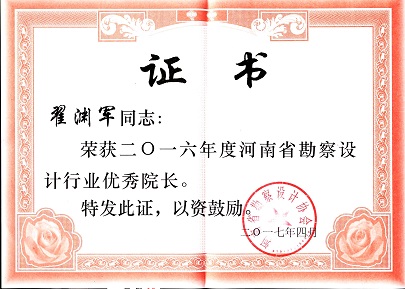 為樹立典型,表彰先進(jìn),進(jìn)一步調(diào)動(dòng)河南省全行業(yè)勘察設(shè)計(jì)人員的積極性,促進(jìn)行業(yè)健康發(fā)展,河南省勘察設(shè)計(jì)協(xié)會(huì)開展行業(yè)突出貢獻(xiàn)、行業(yè)優(yōu)秀企業(yè)和行業(yè)優(yōu)秀院長的評選。我公司被河南省勘察設(shè)計(jì)協(xié)會(huì)評為“2016年度河南省勘察設(shè)計(jì)行業(yè)突出貢獻(xiàn)獎(jiǎng)企業(yè)”,翟淵軍董事長再次榮獲“2016年度河南省勘察設(shè)計(jì)行業(yè)優(yōu)秀院長”。