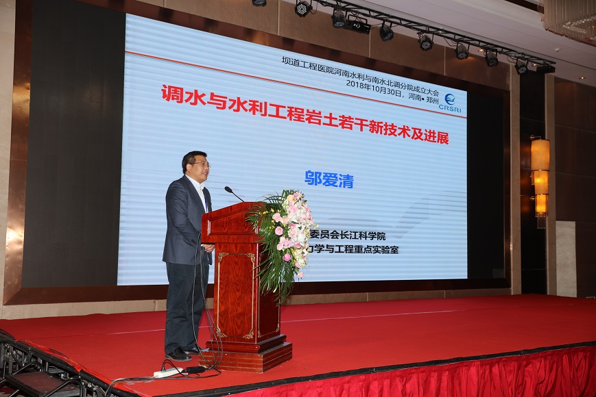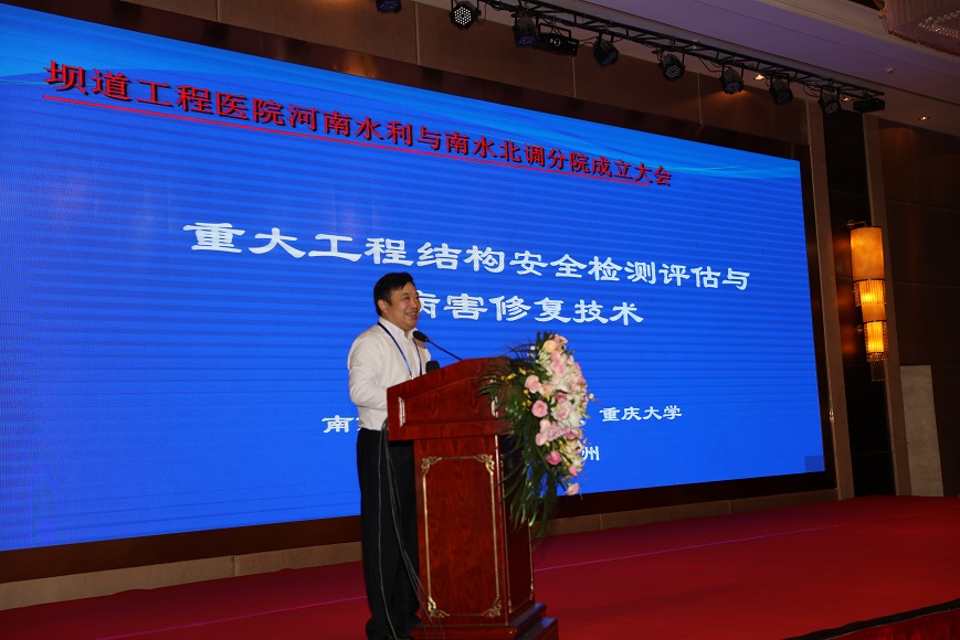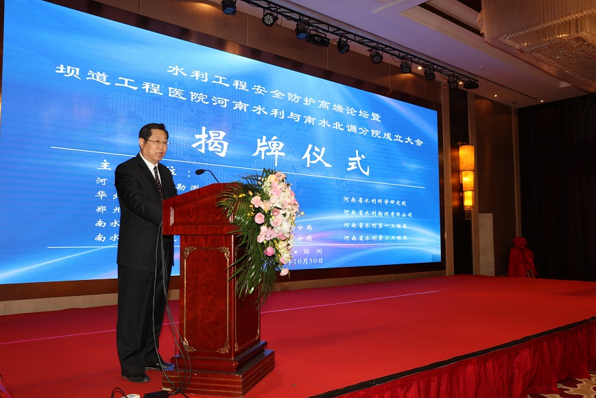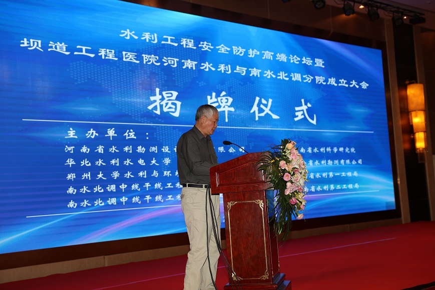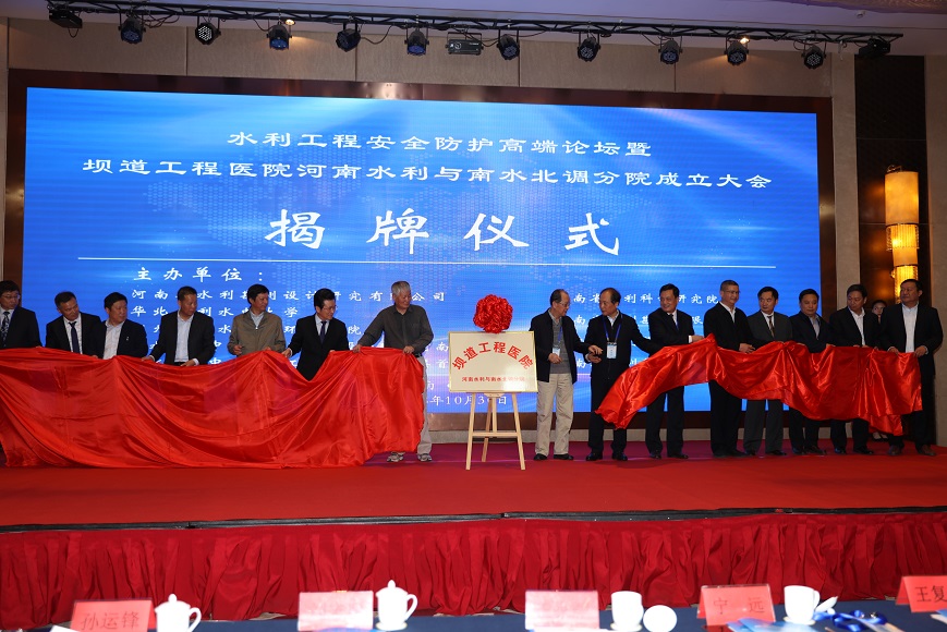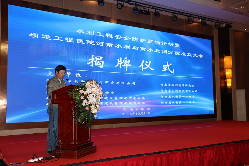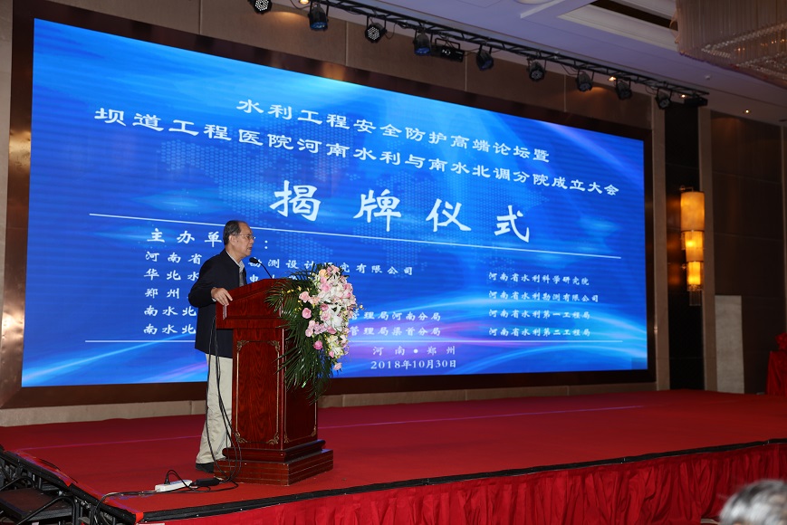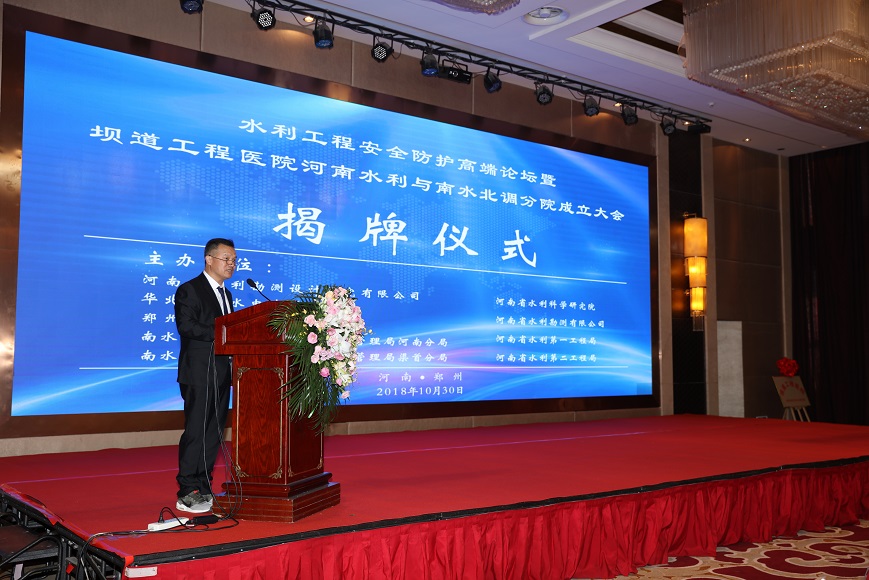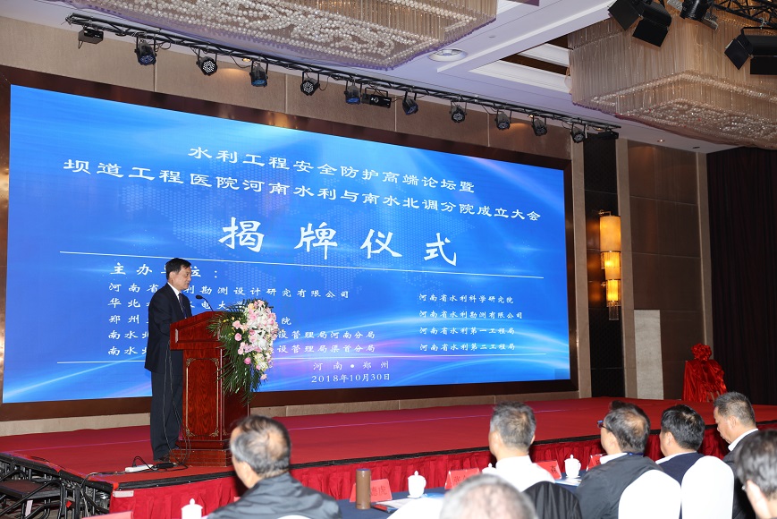 2018年10月30日上午,水利工程安全防護高端論壇暨壩道工程醫(yī)院河南水利與南水北調(diào)分院成立大會在鄭州天鵝城國際飯店隆重召開。中國工程院王家耀院士、王復(fù)明院士等來自40多家單位的領(lǐng)導(dǎo)、嘉賓200多人參會。會議開幕式由河南省水利勘測設(shè)計研究有限公司翟淵軍董事長主持,華北水利水電大學(xué)劉文鍇校長致歡迎辭,相關(guān)領(lǐng)導(dǎo)講話,王復(fù)明院士介紹了《壩道工程醫(yī)院建設(shè)進展》,會議舉行了揭牌儀式和高端論壇。