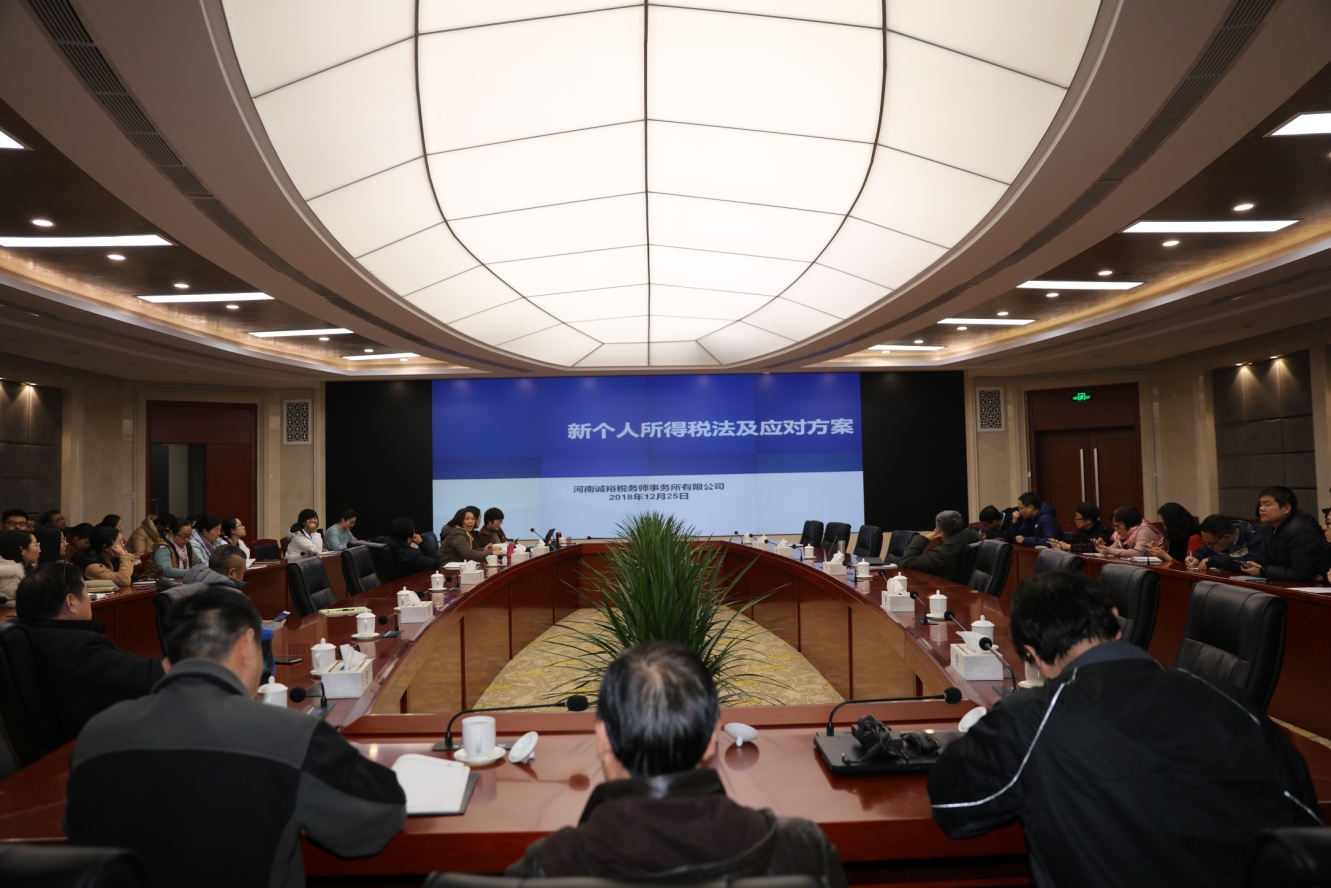 2019年1月3日下午,中華人民共和國個人所得稅法宣貫培訓會在公司二樓多功能廳舉行,邀請了河南誠裕稅務師事務所李愛娟副總經理進行培訓,財務部部長崔薇主持了會議,公司領導趙廷華及各生產院、各管理部門負責人等80多位員工參加了此次培訓。