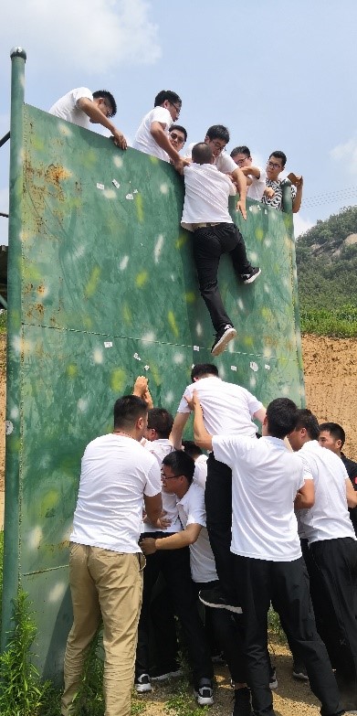 畢業(yè)墻:一面4.2米的高墻,不借助任何外界工具,在規(guī)定的時(shí)間內(nèi)全體人員完成逃生任務(wù)。看似不可能完成的任務(wù),在教練的指導(dǎo)下大家迅速制定戰(zhàn)術(shù),通過搭建起層層人梯,人踩人、人舉人、人拉人的方式奮力拼搏,精誠合作在短短9分鐘完成了任務(wù)。當(dāng)最后一位隊(duì)友在大家的努力下成功翻越畢業(yè)墻的瞬間,雀躍的歡呼聲久久不散,這是一個(gè)看似不可能完成的任務(wù),卻在團(tuán)隊(duì)的共同努力下有如此震撼的結(jié)果,團(tuán)隊(duì)的力量,人梯奉獻(xiàn)的力量,給團(tuán)隊(duì)的每一位成員都帶來極大的震撼和自豪,大家忘卻肩膀血痕累累的痛楚,忘卻克服高空經(jīng)歷的恐懼,記住了被一雙雙手托舉和拉拽的安全感,記住了團(tuán)隊(duì)的強(qiáng)大。