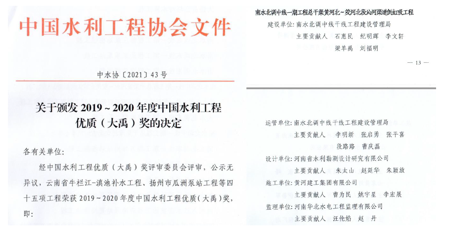 近日,中國水利工程優(yōu)質(zhì)(大禹)獎(jiǎng)評(píng)選結(jié)果揭曉,由豫水設(shè)計(jì)公司擔(dān)綱設(shè)計(jì)的南水北調(diào)中線一期工程總干渠黃河北~羑河北段沁河渠道倒虹吸工程,憑借科學(xué)設(shè)計(jì)和精良施工,榮獲2019年~2020年度中國水利工程優(yōu)質(zhì)(大禹)獎(jiǎng)。