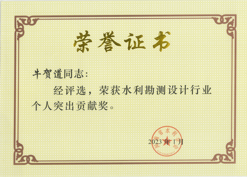 為鼓勵(lì)水利科技工作者開拓創(chuàng)新,2022年11月,河南省水利學(xué)會(huì)在全省開展2022年度個(gè)人突出貢獻(xiàn)獎(jiǎng)評(píng)選活動(dòng),19名同志被評(píng)為勘測(cè)設(shè)計(jì)類個(gè)人突出貢獻(xiàn)獎(jiǎng),公司技術(shù)副總監(jiān)牛賀道和工程設(shè)計(jì)二院張帥兩位同志獲此殊榮。