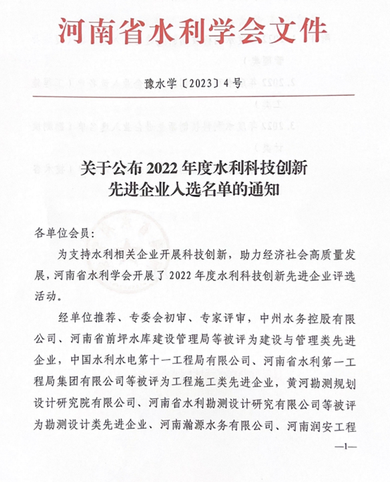 為支持水利企業(yè)開展科技創(chuàng)新,助力經(jīng)濟(jì)社會高質(zhì)量發(fā)展,河南省水利學(xué)會自2022年11月開展了2022年度水利科技創(chuàng)新先進(jìn)企業(yè)評選活動。經(jīng)激烈角逐,共有11家企業(yè)入選,豫水設(shè)計(jì)公司被評為“勘測設(shè)計(jì)先進(jìn)企業(yè)”。
