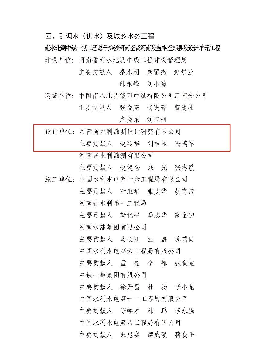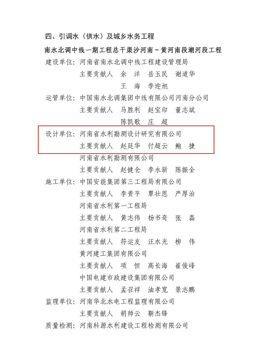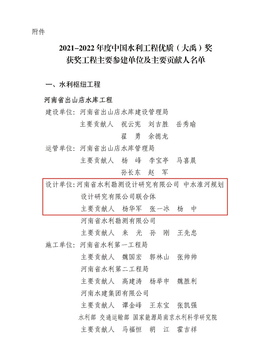 近日,經(jīng)中國水利工程優(yōu)質(zhì)(大禹)獎評審委員會評審及公示,公司參與設計的《河南省出山店水庫工程》《南水北調(diào)中線一期工程總干渠沙河南~黃河南段潮河段工程》《南水北調(diào)中線一期工程總干渠沙河南至黃河南段寶豐至郟縣段設計單元工程》三項工程榮獲2021-2022年度中國水利工程優(yōu)質(zhì)(大禹)獎。