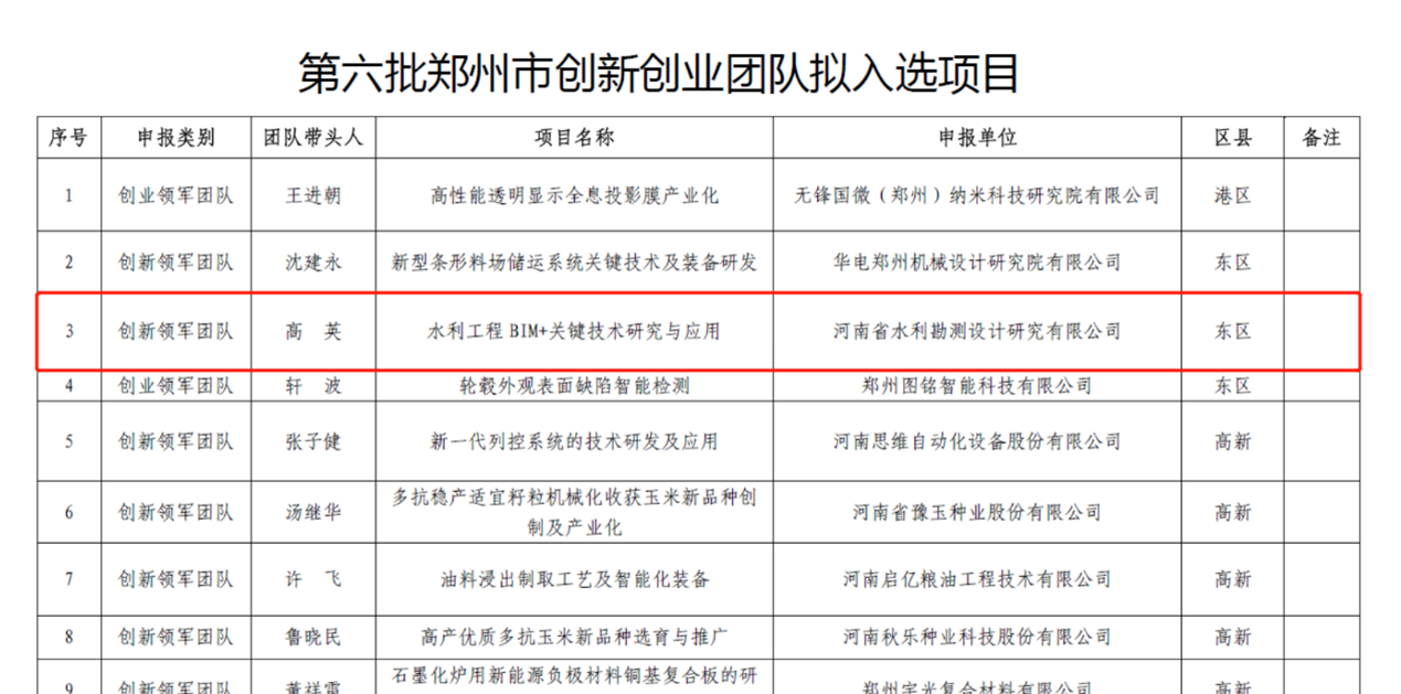 近日,根據(jù)鄭州市科技局“第六批鄭州市創(chuàng)新創(chuàng)業(yè)團(tuán)隊(duì)項(xiàng)目擬入選項(xiàng)目公示”,我公司副總經(jīng)理高英帶領(lǐng)團(tuán)隊(duì)開(kāi)展的“水利工程BIM+關(guān)鍵技術(shù)研究與應(yīng)用”入選2023年第六批鄭州市“創(chuàng)新領(lǐng)軍團(tuán)隊(duì)項(xiàng)目”。