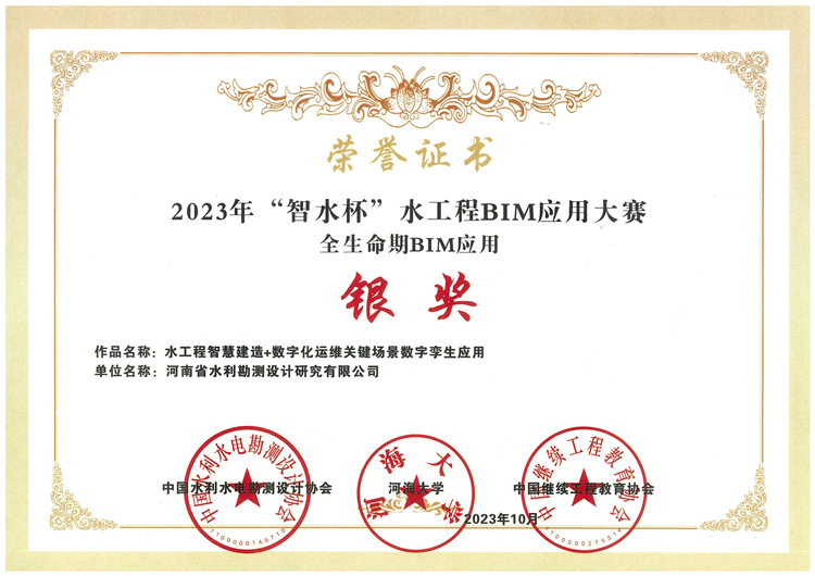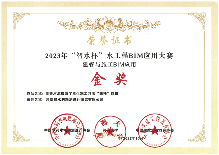 近日,2023年“智水杯”水工程BIM應用大賽獲獎項目公示。豫水設計公司申報項目《賈魯河流域數字孿生施工度汛“四預”應用》獲建管與施工BIM應用金獎;《水工程智慧建造+數字化運維關鍵場景數字孿生應用》獲全生命期BIM應用銀獎。