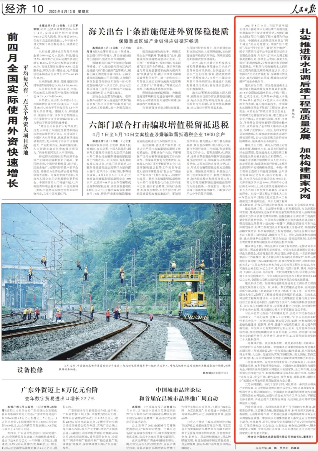 5月13日,在習近平總書記發表“5·14”重要講話一周年之際,《人民日報》刊發中國南水北調集團有限公司黨組書記、董事長蔣旭光署名文章《扎實推進南水北調后續工程高質量發展 加快構建國家水網》。