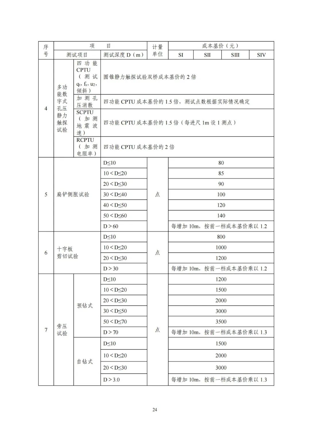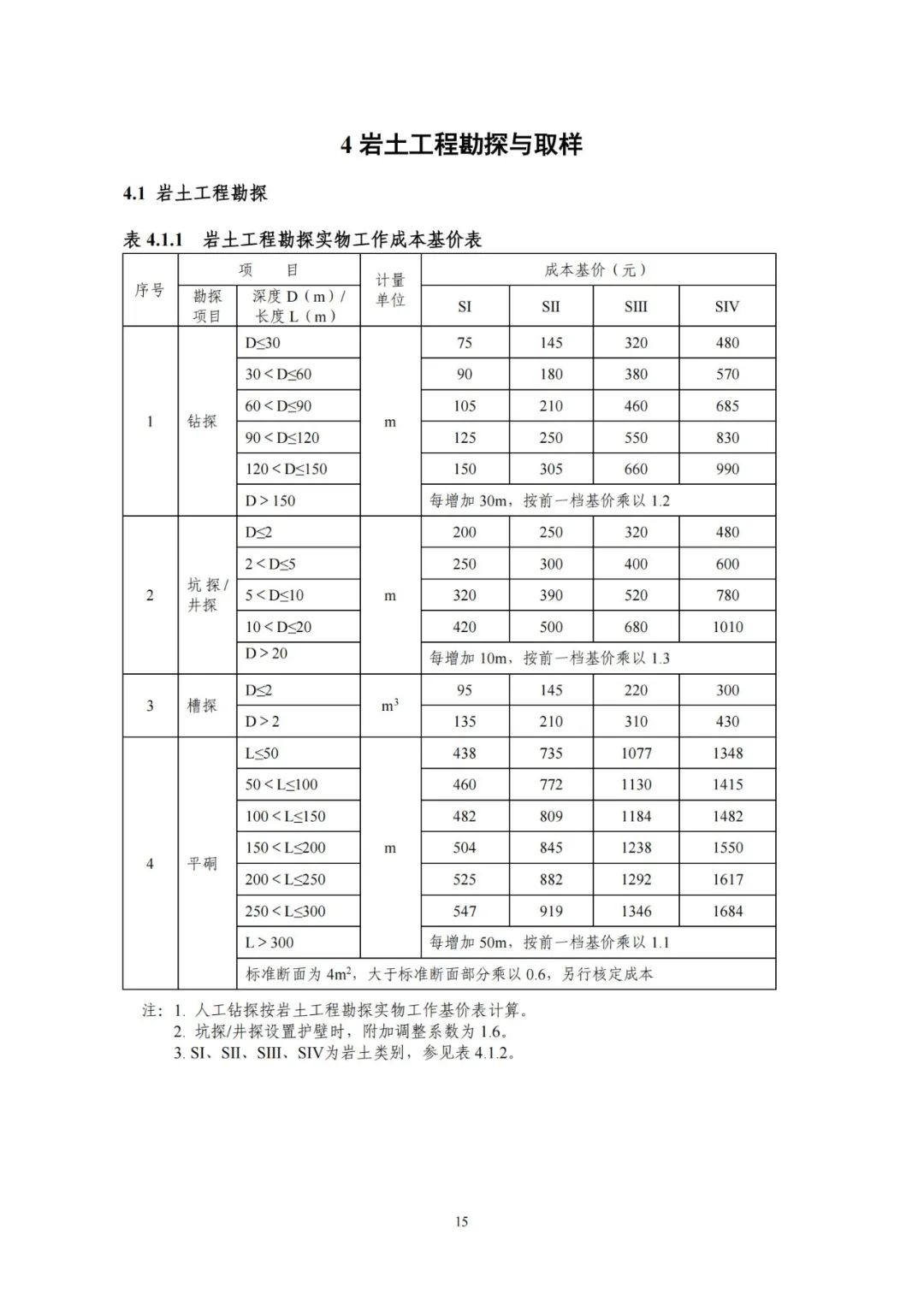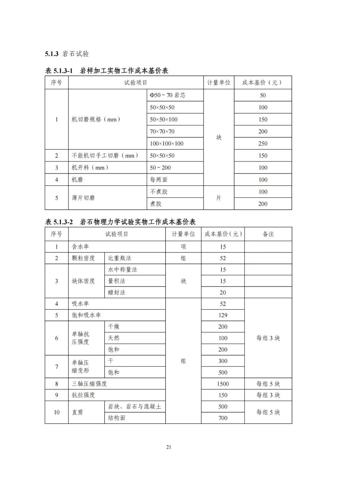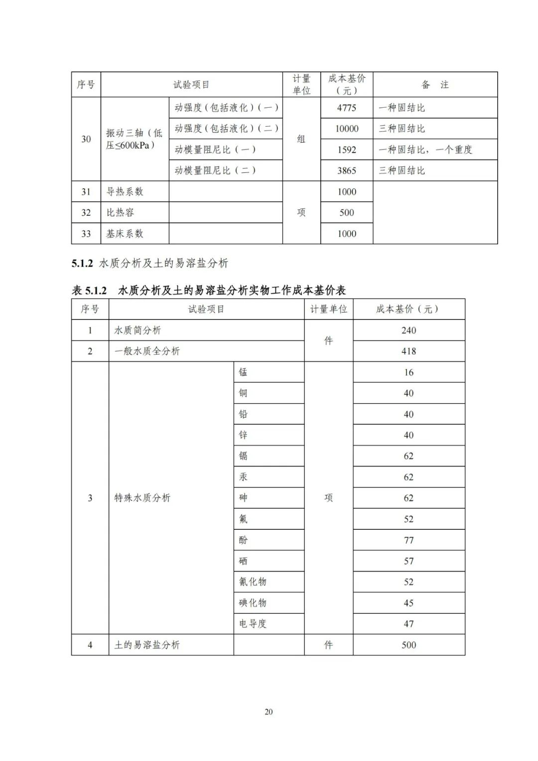 《要素信息》分為八章,相關成本測算分為工程費法(其包含巖土工程勘察、巖土工程勘察咨詢與監理、巖土工程設計和專業工程咨詢)、實物工作量法(其包含工程地質測繪與遙感地質解譯、巖土工程勘探與取樣、巖土工程試驗/檢測與監測、工程測量、水文地質勘察)及人工日法三類。除傳統的巖土工程試驗、測試和工程測量項目外,實物工作成本包括了土的易溶鹽及導熱系數等室內試驗、多功能數字式孔壓靜力觸探試驗、溫度測量等工程物探、海洋和內陸水域測量、無人機航空攝影測量、地面三維激光掃描測量、規劃測量等以新技術方法為主的專業技術服務項目。