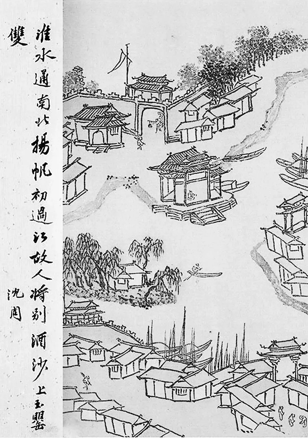 圖為明代畫家沈周的《兩江名勝圖冊(cè)》,題款:淮水通南北,揚(yáng)帆初過江。故人將別酒,沙上玉罌雙。